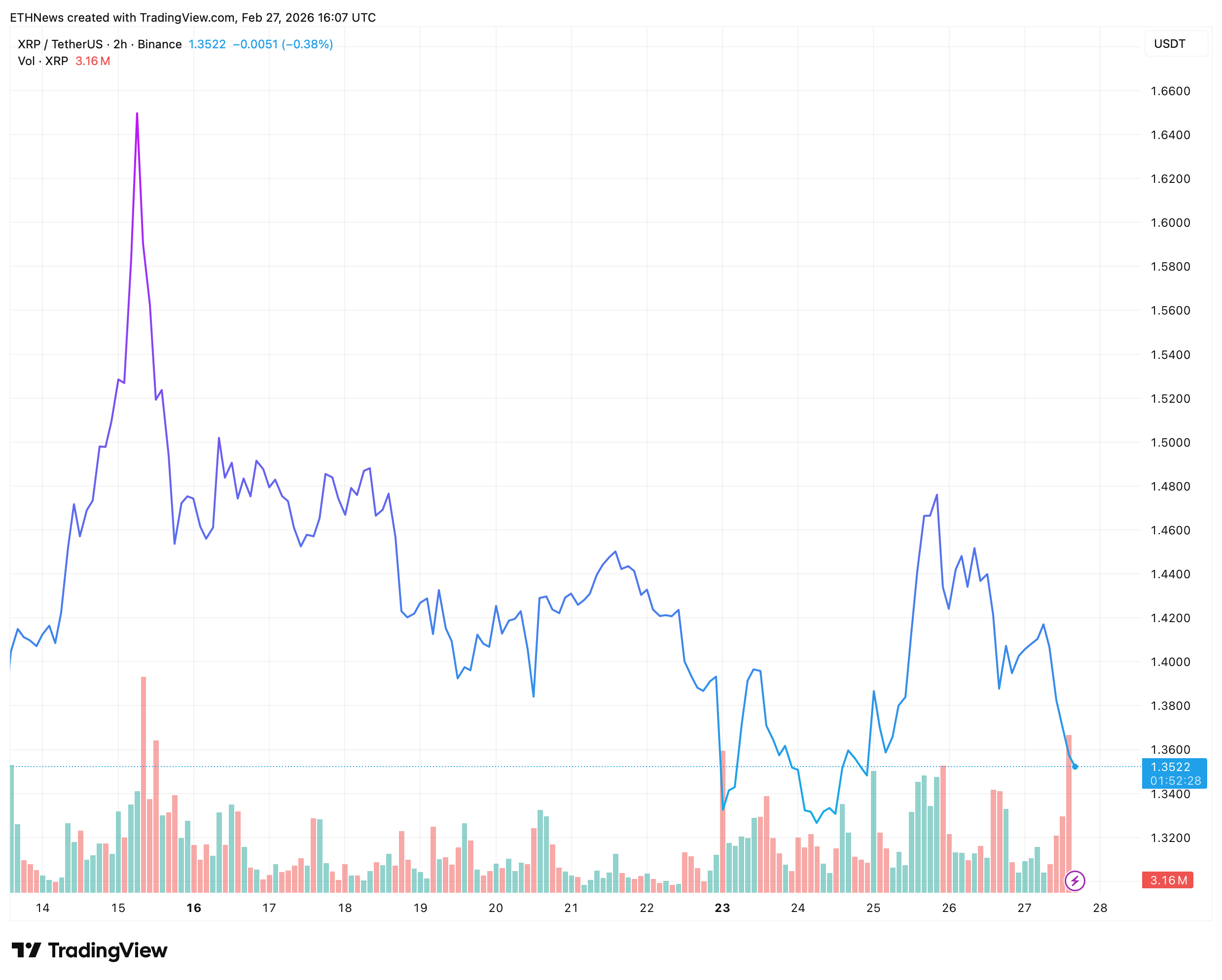 2月23日的低点伴随着图表上最大的卖出成交量。随后的反弹十分迅猛,XRP在2月25日从1.30美元回升至1.48美元,但动能迅速耗尽并反转,未能威胁到1.50美元区域——该区域在2月中旬的下跌中曾扮演支撑角色。