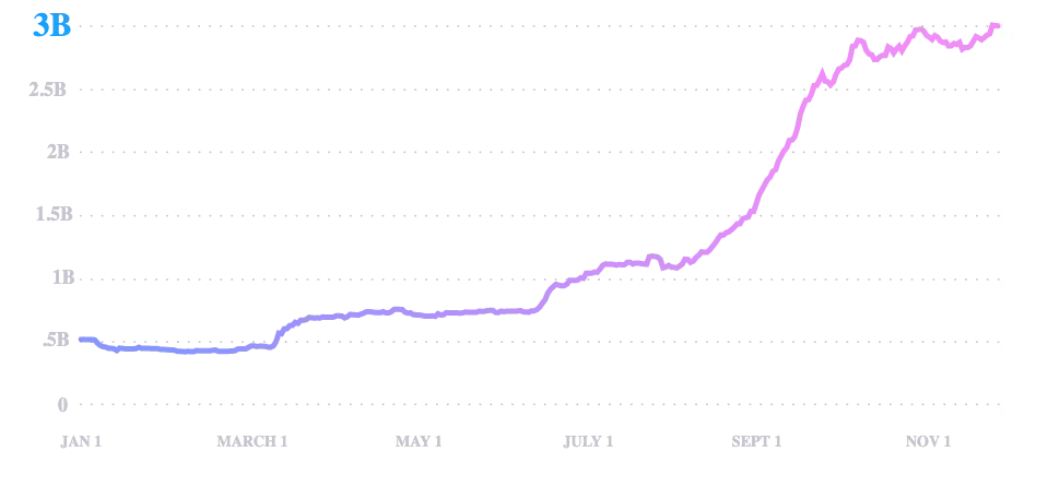 尽管存在这些波折,Tether在2020年实现了惊人的增长,不仅在交易量方面,而且在市值方面也是如此。