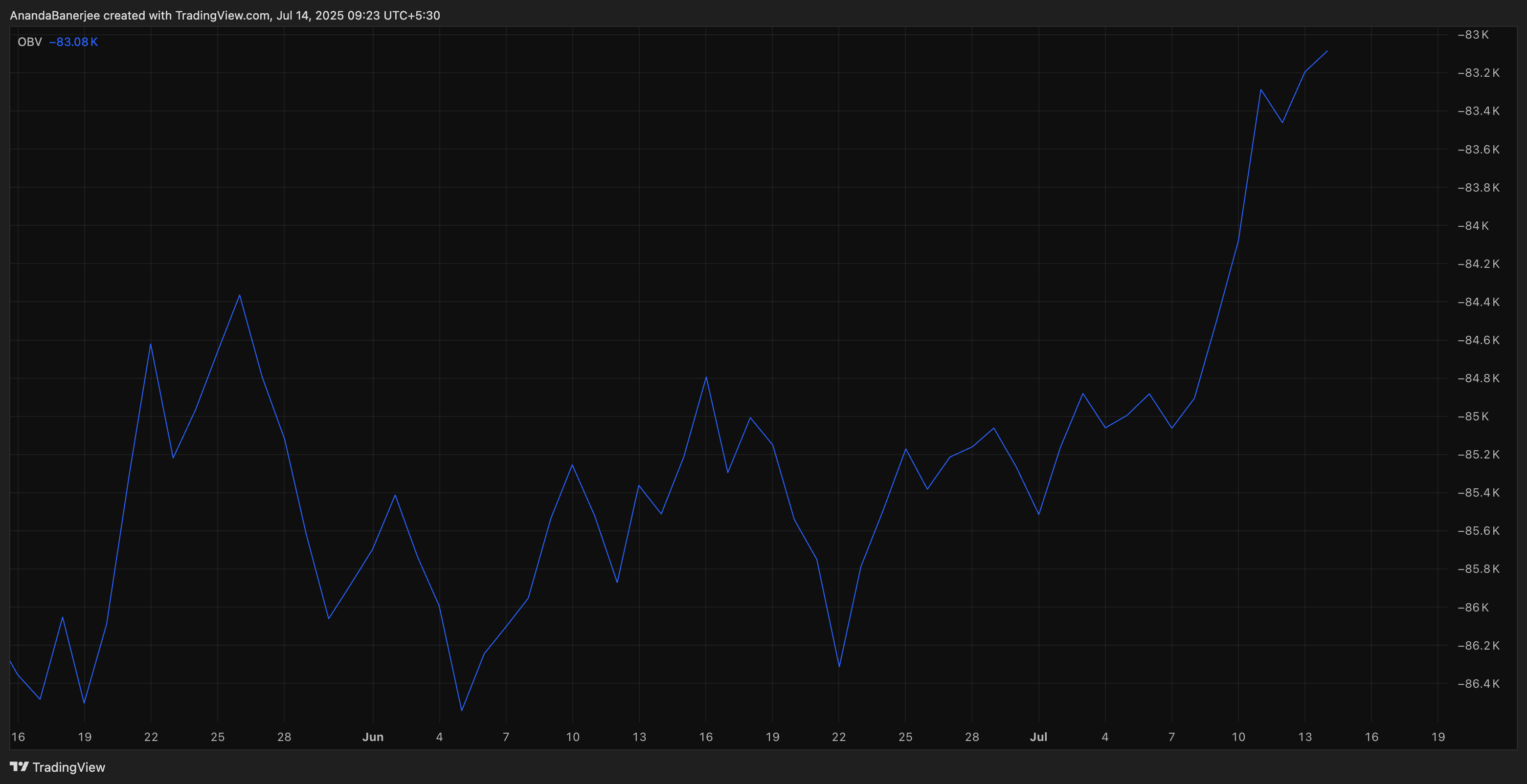 能量潮指标(OBV)与比特币价格同步上升,表明买盘量能持续支撑涨势,未出现明显的量价背离或动能衰竭。