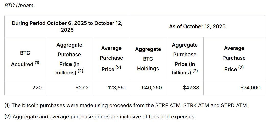 领先的比特币储备公司MicroStrategy于10月13日宣布,在10月6日至10月12日期间以每枚123,561美元的平均价格增持了220枚比特币,耗资2720万美元。完成此次增持后,MicroStrategy的比特币持仓量正式达到640,250枚,总投资额达473.8亿美元,平均成本为每枚74,000美元。