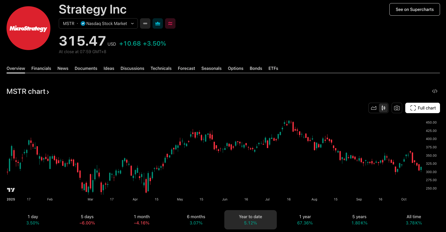 MicroStrategy股票MSTR在过去一个月经历大幅波动。10月初MSTR曾短暂冲高至360美元,但可能受10月11日加密货币市场大规模清算及随后比特币价格下跌影响,目前股价已回落至300美元左右,市值缩水至8750亿美元。