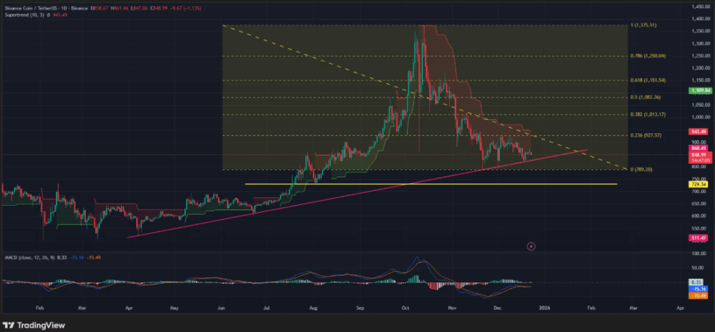 技术指标确认趋势疲软:MACD线已跌破零轴,显示动能减弱;同时BNB跌破超级趋势指标,且该指标已转为红色——表明看跌结构依然完整。
