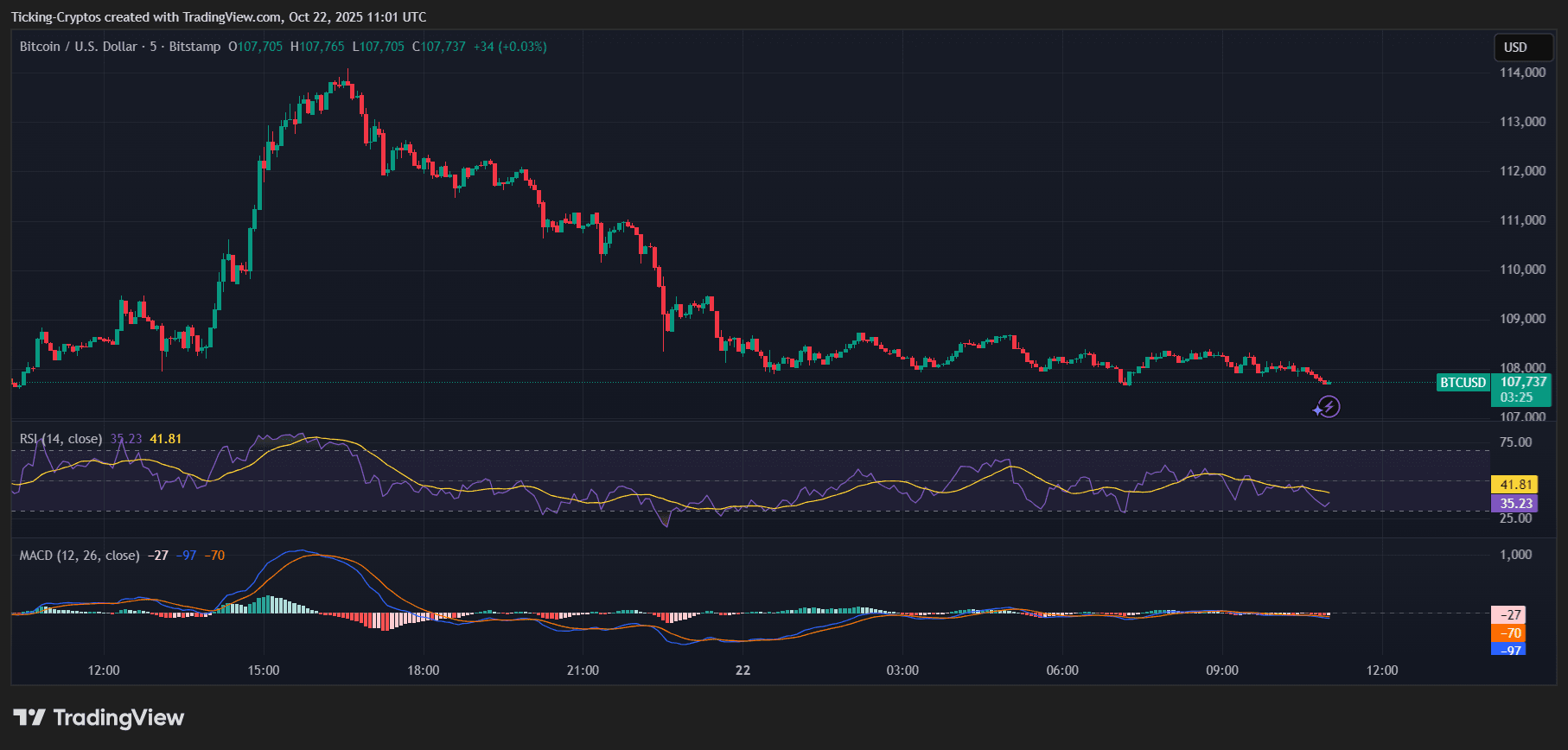 比特币走势图显示市场情绪如何从看涨快速转向看跌。在未能站稳114,000美元上方后,BTC接连跌破多个短期支撑位。RSI指标滑落至40下方,同时MACD形成死叉——两者都确认了动能衰竭。除非比特币能带量收复110,000美元关口,否则像卡尔达诺这样的风险资产很可能持续承压。