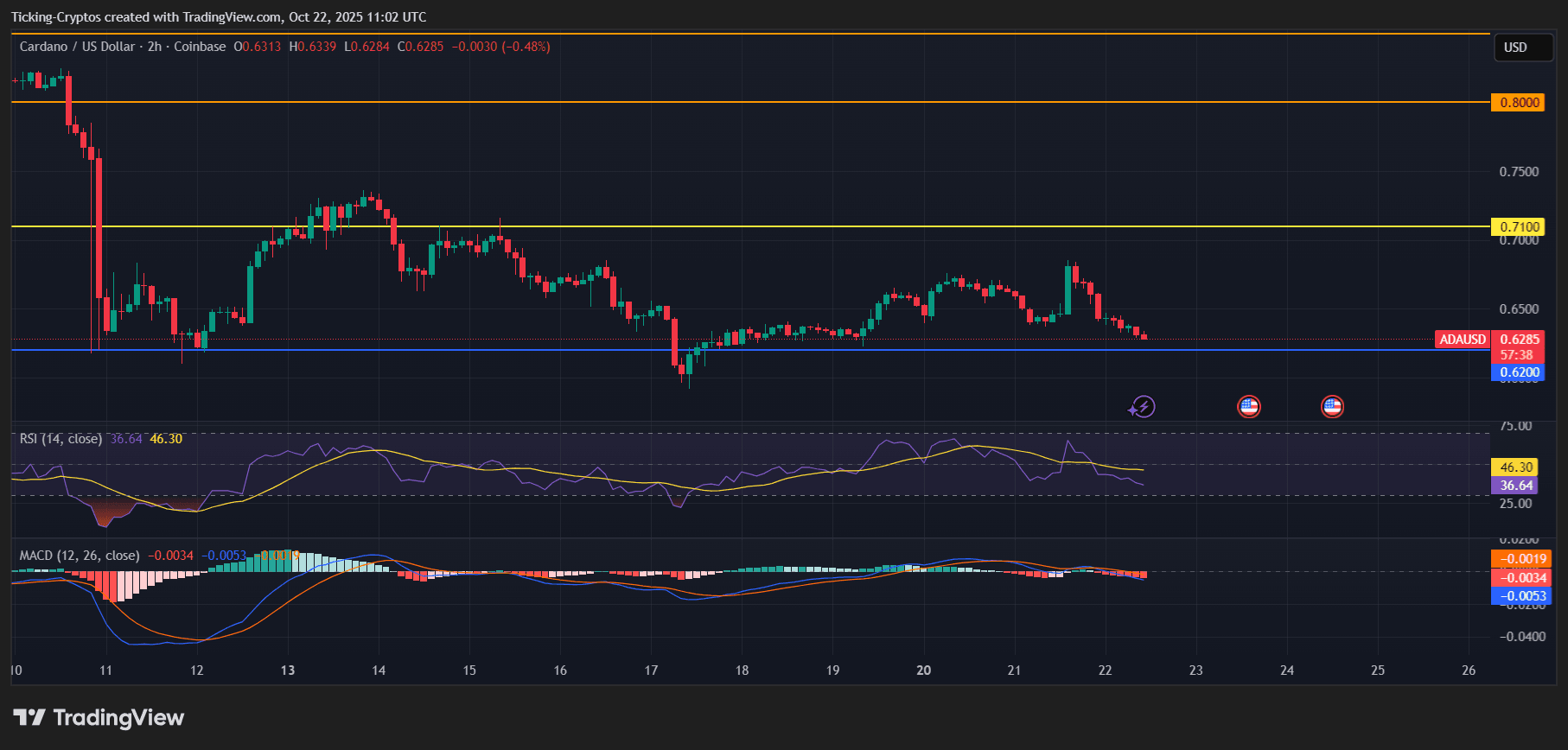 卡尔达诺(ADA/USD)图表呈现类似结构。在0.65美元附近短暂反弹后,ADA回落至0.628美元,目前徘徊在0.62关键支撑位上方。