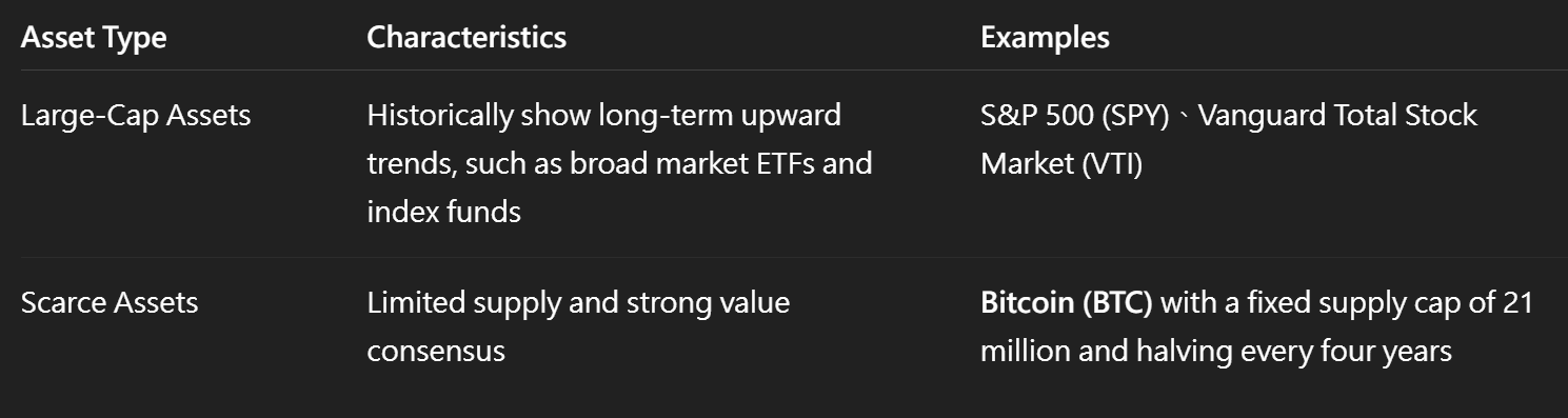 定投策略通常适用于两类资产:大盘成长型资产和稀缺性资产。比特币凭借其程序化稀缺性完美契合后者特征。