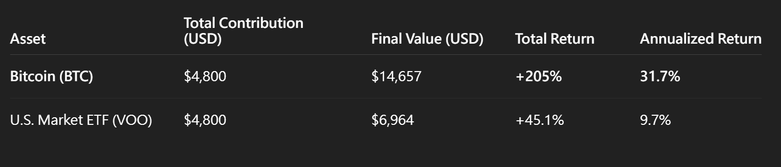 - 即使最差时机入场,比特币定投205%的总回报仍远超传统股指ETF