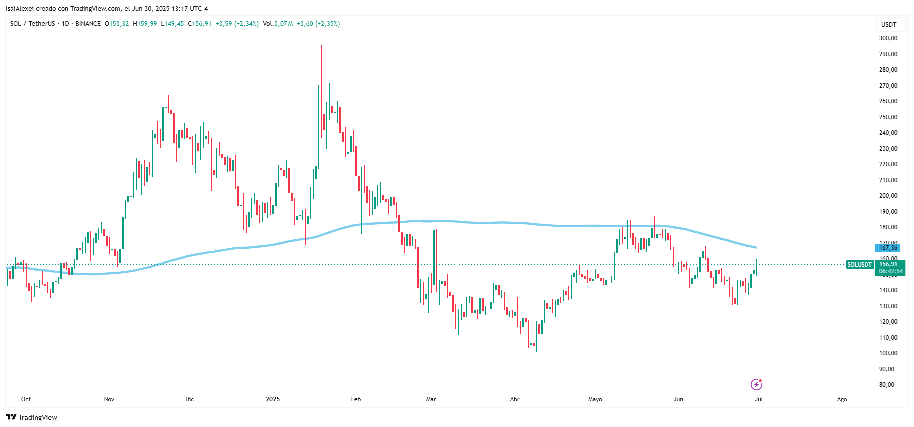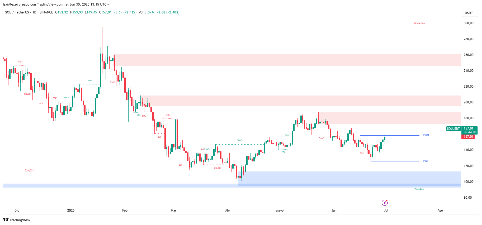 截至最新数据,Solana(SOL)现报156.92美元,单日上涨2.35%,周线累积涨幅达19.16%,成为近期表现最佳的Layer1代币之一。尽管年内仍下跌17.09%,但本月已转为微幅上涨(+0.48%),显示其技术面突破盘整格局。