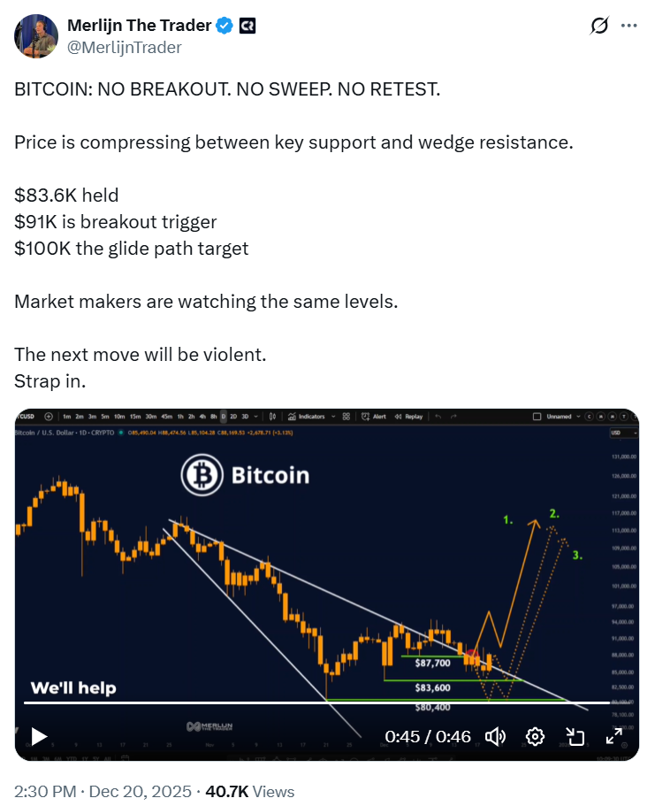 比特币价格本周始终未能突破90,000美元关口。市场评论员与KOL普遍预期波动将加剧。交易员Merlijn指出比特币既未形成突破也未进行回测,处于“盘绕”状态,预示后续可能出现剧烈波动。他强调本周既未下探80,600美元,也未能突破87,000美元,同时未跌破80,400美元支撑位。