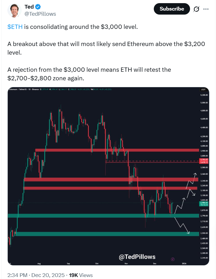 以太坊价格本周始终受制于2,900美元阻力。分析师Ted Pillows认为,若成功突破该关键位,ETH可能快速冲高至3,200美元,反之或下探2,700美元。