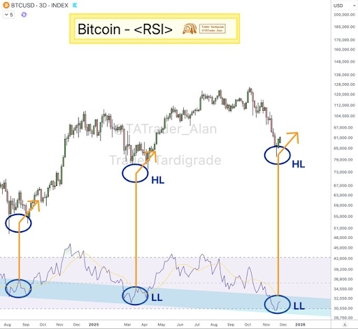 正如交易员Trader Tardigrade所指出的,比特币在三日时间框架内进入建设性技术区域。RSI回归传统支撑反弹区,该区域曾支撑过往周期转折点。指标形成更低低点而价格形成更高低点,呈现隐性看涨背离。