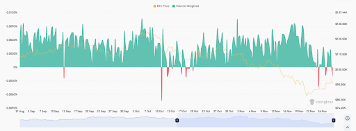 八月末至十一月末的交易量加权资金费率图表记录了衍生品头寸的转变。当比特币在10-13万美元区间震荡时,资金费率在九月大部分时间和十月初保持正值。此期间多头头寸占据主导,反映出强烈的投机信心。
