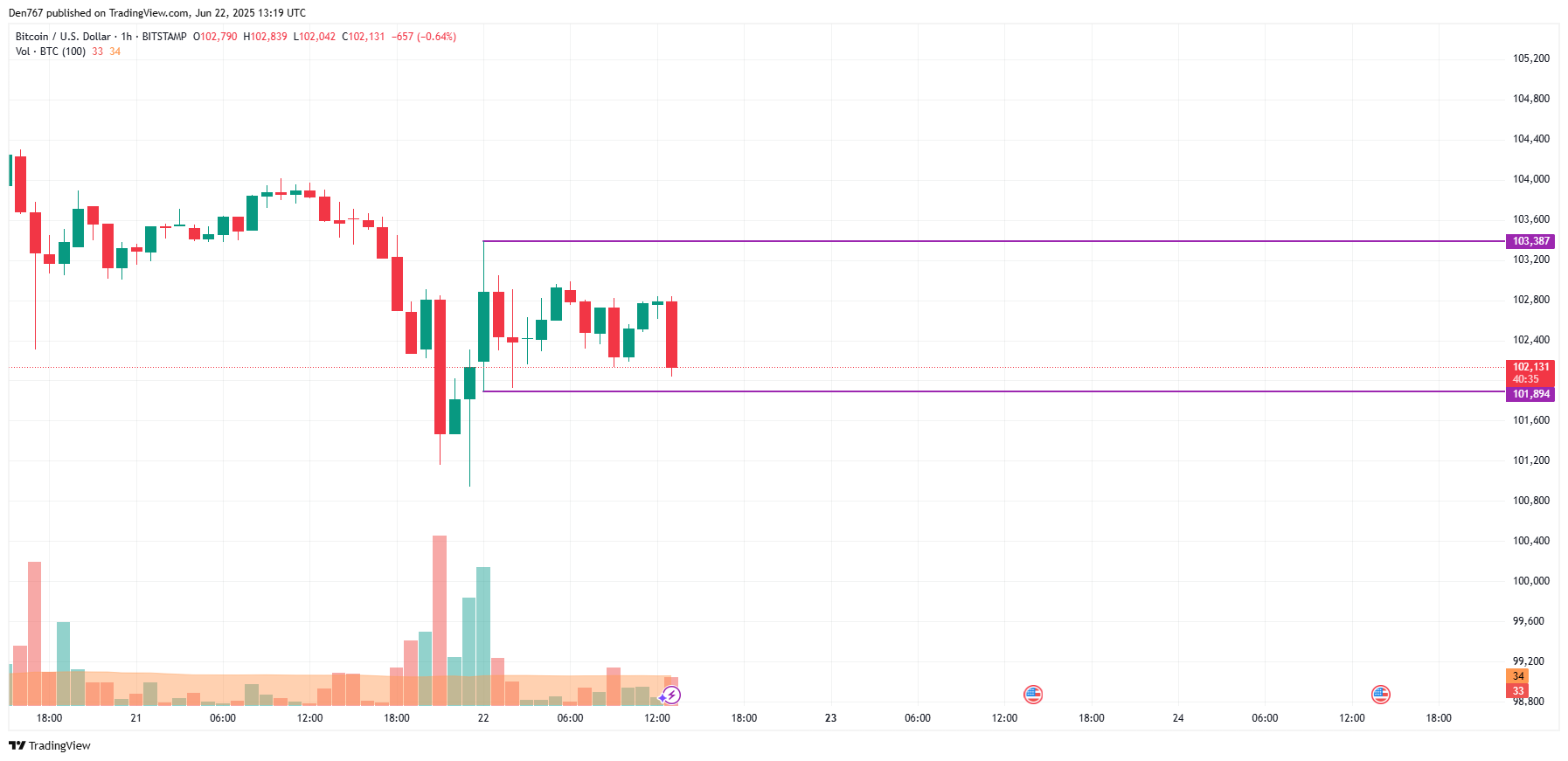 从小时线来看,BTC价格持续呈现下行趋势。当前价格正测试101,894美元支撑位,若有效突破该点位,积累的下行动能将可能推动价格下探101,000美元区间。