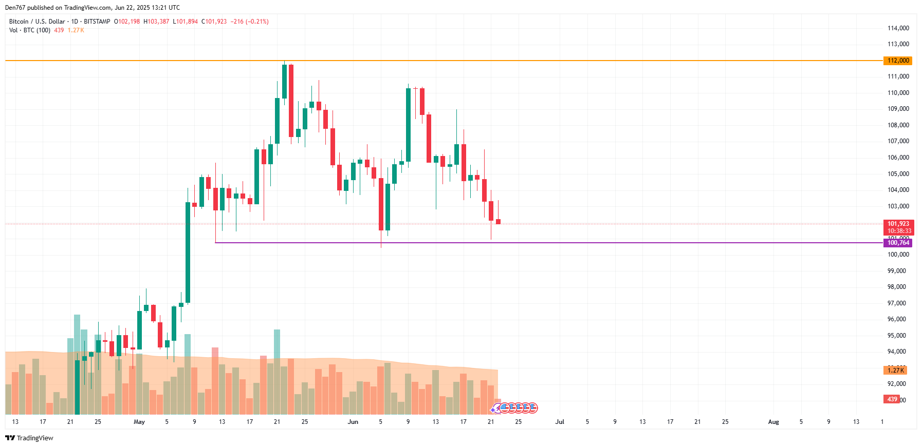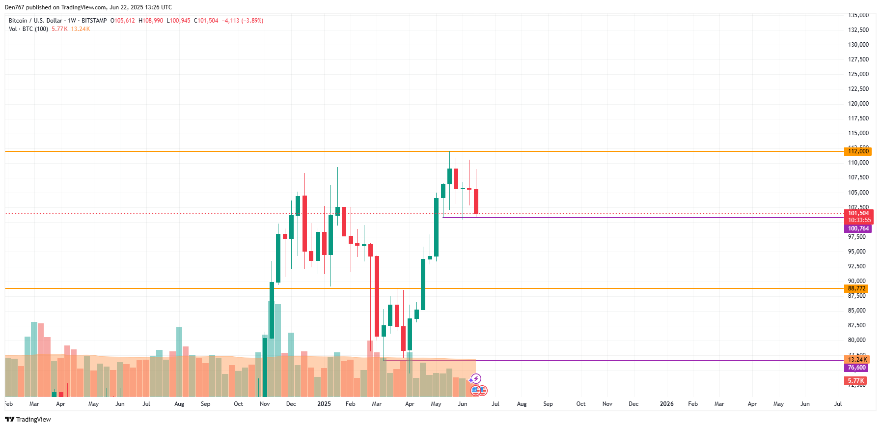 更大时间框架的图表同样显示熊市信号。若日线收盘维持在目前价位或更低水平,预计月底将测试关键的100,000美元心理关口。