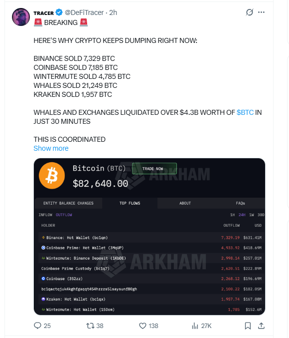 令跌势加剧的关键在于抛售者的身份,而不仅是价格下跌的速度。根据Tracer(@DeFiTracer)分享的数据,主要参与者在短时间内大量出货:币安售出7,329 BTC,Coinbase售出7,185 BTC,Wintermute售出4,785 BTC,Kraken售出1,957 BTC。同期仅巨鲸便抛售约21,249 BTC。