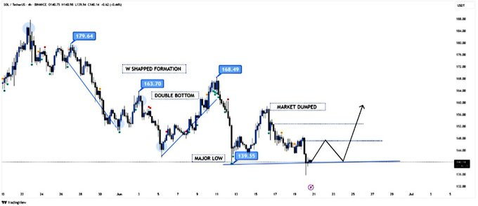 分析师BitGuru追踪的W形态结构显示,若SOL能守住139.55美元支撑,可能确认看涨反转。其图表显示双底形态已在168.49美元完成突破,并回踩颈线。