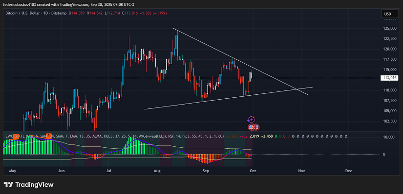 在创下124,500美元的历史新高后,比特币持续在对称三角形内震荡,关键支撑位尚未跌破。当前113,016美元(-1.19%)的价格显示市场正处于决策前的胶着状态。近期基本面呈现多重变化:ETF资金大幅外流、机构仓位调整,以及SEC新规可能加速加密基金落地。