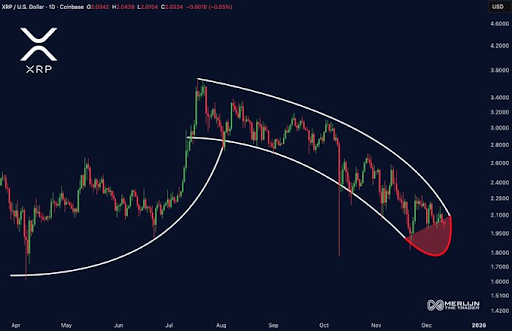 Merlijn The Trader指出XRP正在构筑缓慢结构的“发射平台”,日线图可见明显压缩态势。图表显示价格自4月3.70美元上方的峰值呈圆弧状下跌,并逐渐转入下降曲线通道。