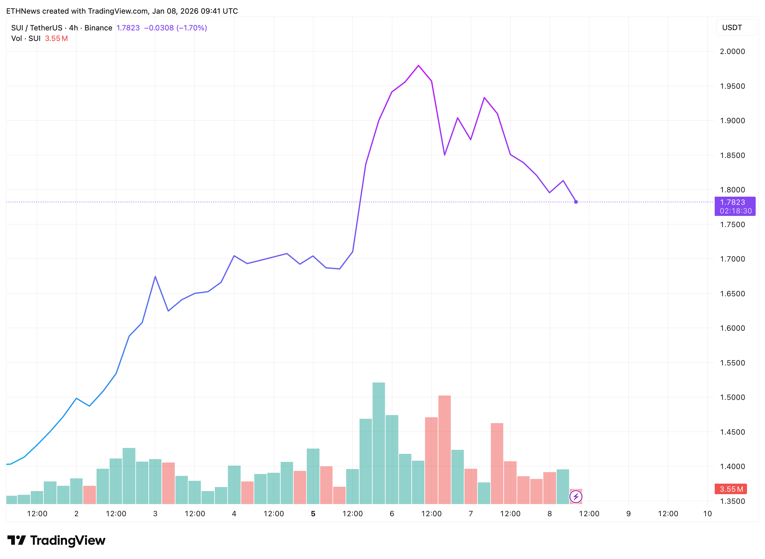 最新图表显示,SUI当前交易在1.78至1.82美元附近,于已转化为支撑的前阻力区上方盘整。1.70至1.75美元区间是短期需关注的主要水平。只要该支撑带保持稳固,行情更可能延续盘整或再次上探1.95至2.00美元附近的前期高点。若能持续维持在1.70美元上方,则再次上攻的可能性将增加。