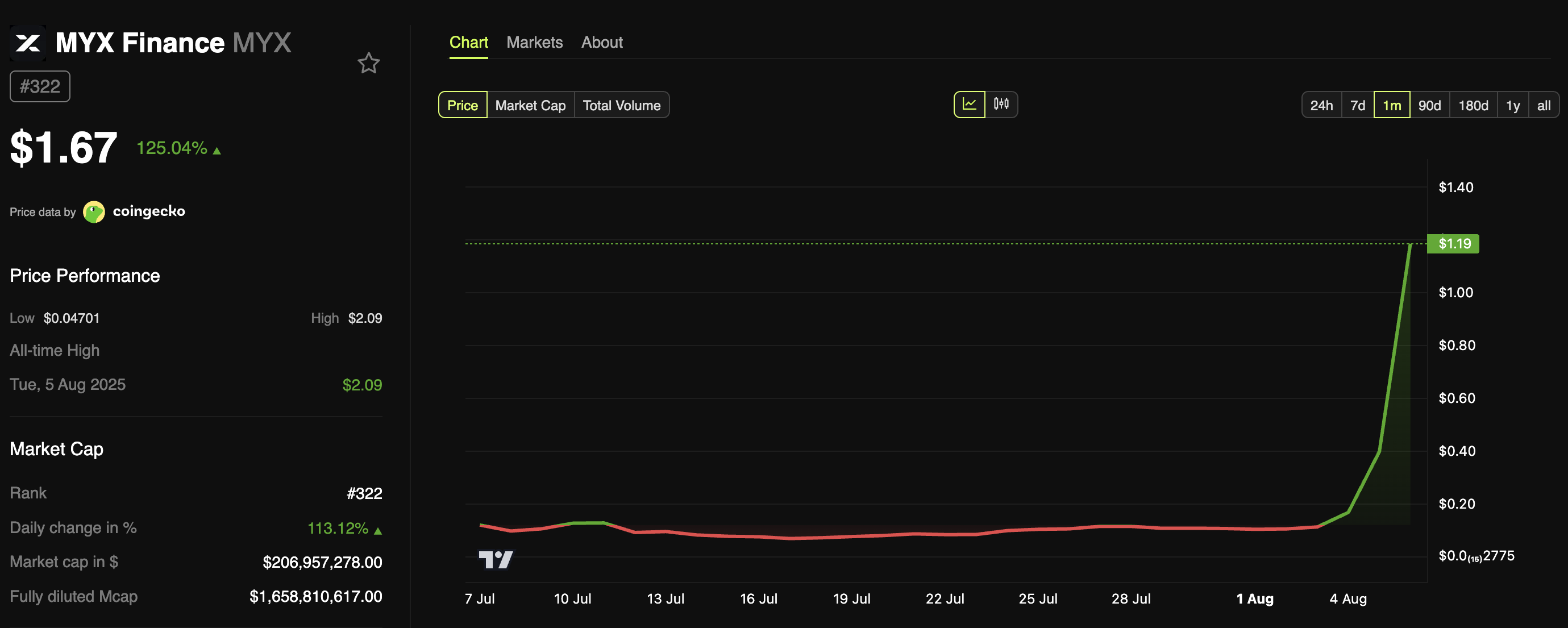 MYX代币于5月初通过Binance Wallet第15期独家代币生成活动(TGE)发行。上线后陆续登陆Gate.io、MEXC、Bitget等交易所。6月19日曾触及历史低点,但8月迎来爆发式增长——BeInCrypto数据显示,该代币本月累计涨幅达1957%,从0.104美元飙升至昨日2美元以上的历史高点。
