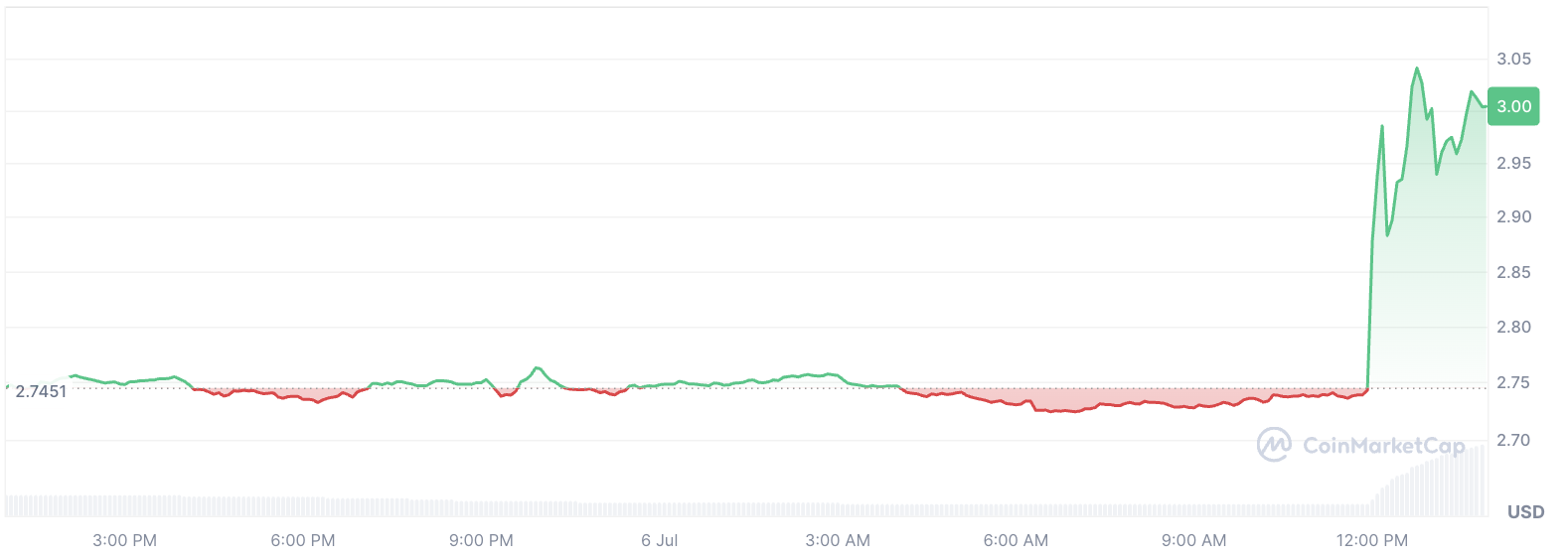 官方公告发布后,Toncoin价格迅速从2.75美元下方飙升至近3.08美元,图表显示单日涨幅达12%。据数据显示,这是该代币近几周来最大的小时线蜡烛图,不仅逆转了持续多日的下跌趋势,更将TON推回关键阻力区。