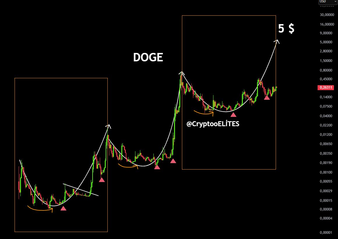 CryptooELITES提供的另一张图表将当前市场结构与狗狗币早前周期进行对比,显示此前两次DOGE在形成圆弧底后均出现强势上涨。目前结构类似且处于相同阶段,该图表还包含通往5美元的预测路径。