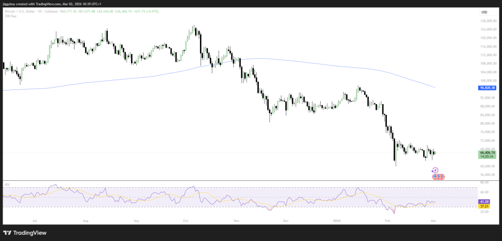 在本轮周期早些时候见顶后,BTC已经形成了更低的高点和更低的低点。最近的这轮抛售导致价格跌向60,000美元区间的低端,随后才再次企稳。BTC当前交易价格为66,430美元。