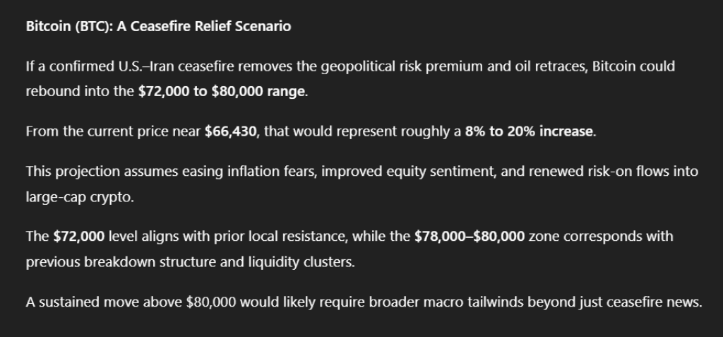如果美国和伊朗正式同意停火,紧张局势缓和,比特币可能反弹至72,000到80,000美元区间。