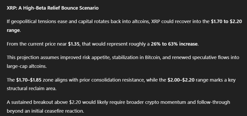 如果局势平息,资金开始回流山寨币,XRP可能上涨至1.70到2.20美元区间。