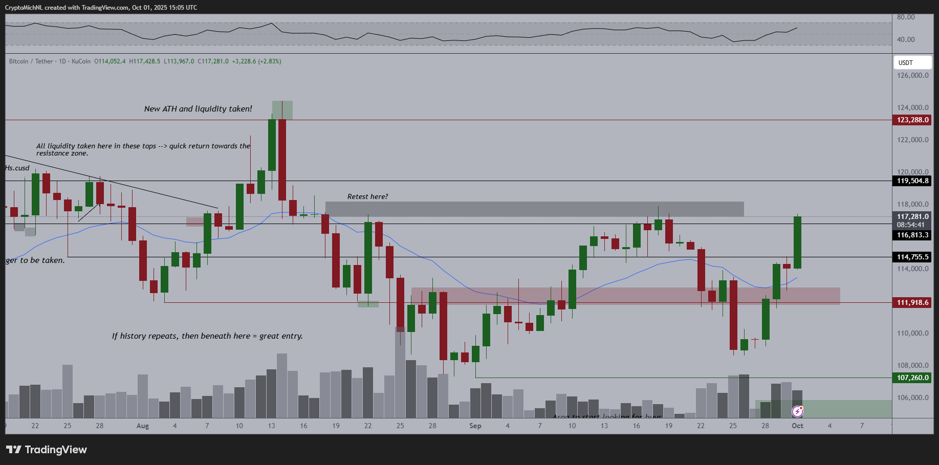 “比特币突破117,000美元为本月开了个好头。站稳112,000美元关口至关重要。虽然9月份需要重新测试这些支撑位,但比特币现已准备好再创历史新高。”