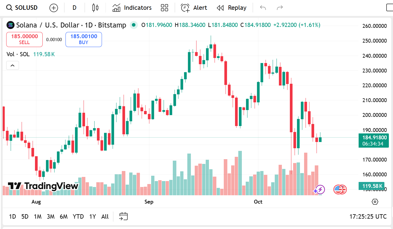 Solana当前报价187美元,过去24小时上涨2.19%。尽管交易量下降38.01%至71.8亿美元,但在数周强劲表现后出现短暂放缓迹象。