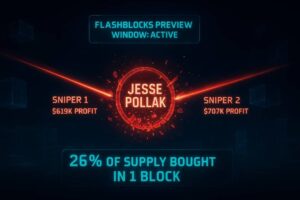杰西·波拉克创作者代币的发行引爆了Base链上有史以来最迅猛的狙击战 代币供应量的50%在数秒内进入流通市场,而在同一个区块中,超过四分之一的总发行量被瞬间购入。随之而来的是一场精心策划的流动性争夺战——两个钱包地址在这场博弈中总计获利130万美元。 事件全貌解析 波拉克部署的创作者代币总发行量为5亿枚,其中50%直接被注入流动性池。当流动性池启动时,内存池瞬间活跃起来。就在同一个区块内,2.617亿枚代币(占总供应量26%)被两名狙击者收入囊中。 这种购买速度并非偶然,而是基础设施优势的体现。通过Base链上新部署的Flashblocks系统,两名狙击者的交易与波拉克的部署交易被纳入同一2025-11-21 -