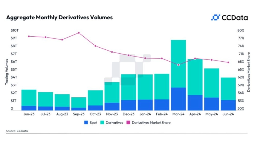 六月加密货币交易量连续第三个月下滑:CCData报告