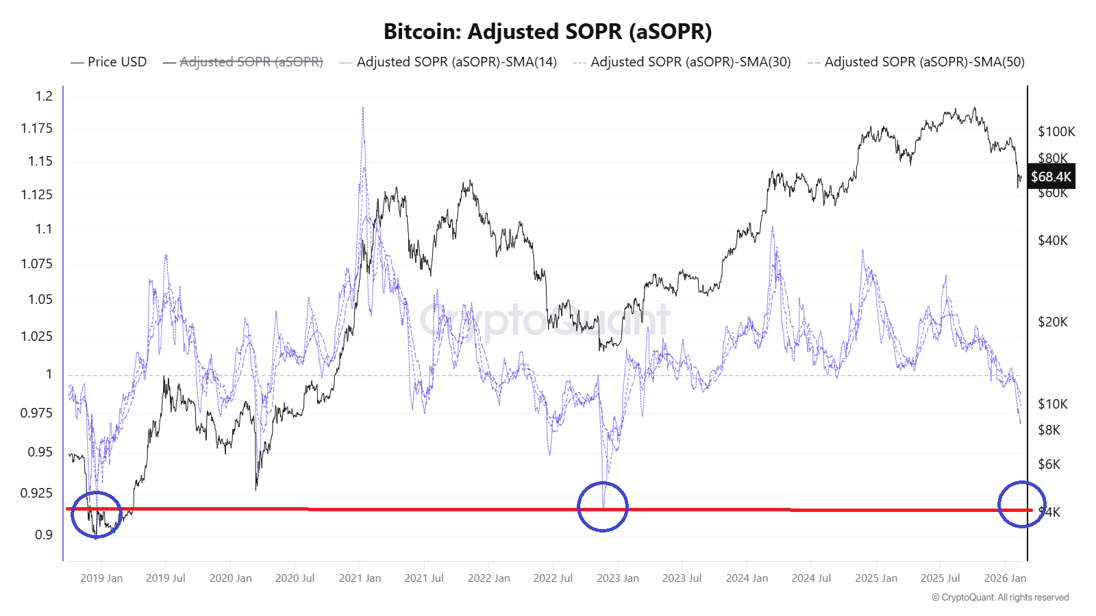 比特币调整后花费产出比率再度逼近历史压力区间比特币调整后花费产出比率已回落至0.92-0.94区间,该区域在历史上多次成为熊市关键压力位。2019年与2023年的深度调整阶段均出现过类似数据,当时投资者普遍处于亏损抛售状态。这一区间往往标志着市场投降压力与结构重置的发生,而当前该指标正再度向该区域靠拢。核心观察指标当调整后花费产出比率低于1时,表明链上筹码正在亏损状态下被转移。历史数据显示多个周期低点形成于0.92-0.93区间,当前市场结构与以往熊市过渡阶段呈现相似特征。与周期中段回调时指标快速收复1.0的情况不同,当前走势显示出持续的弱势格局与亏损兑现压力。若该指标未能迅速重返1.0上方,