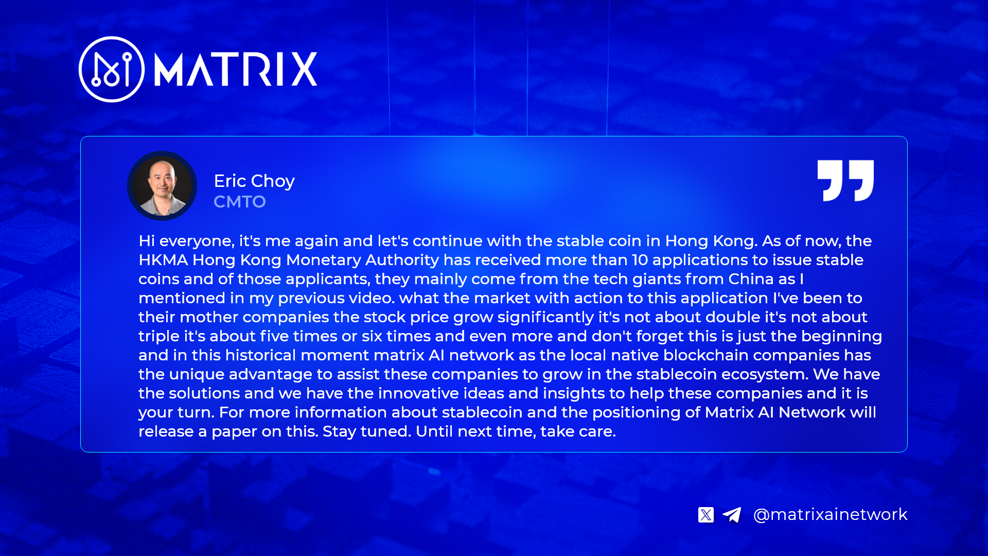 香港稳定币新动态 大家好,我是Eric Choy。今天继续为大家带来香港稳定币的最新进展。截至目前,香港金融管理局(HKMA)已收到超过10份稳定币发行申请,这些申请方主要来自中国科技巨头企业——正如我在上期视频中提到的。 市场反应与机遇 值得注意的是,相关母公司的股价已出现显著增长。这种涨幅并非两倍三倍,而是达到五到六倍甚至更高。需要强调的是,这仅仅是市场启动期的开端。在这个历史性时刻,作为香港本土区块链企业,Matrix AI Network在助力这些公司布局稳定币生态方面具有独特优势。 我们的解决方案 我们拥有成熟的解决方案和创新理念,能够为合作伙伴提供战略支持。关于稳定币2025-07-15 -