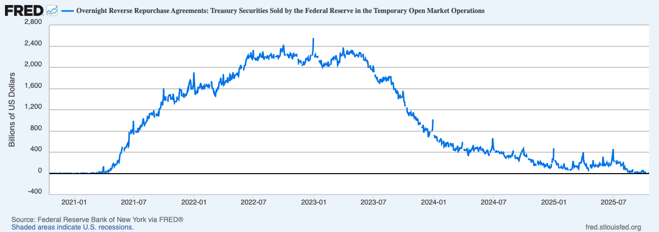终极验证:比特币正赶在美联储之前行动 所有人都在盯着K线图,却没人关注流动性。真相就在这里——数据证明了一切。 1. 量化紧缩正在垂死挣扎 鲍威尔刚刚确认美联储将在数月内结束量化紧缩。流动性压力已经显现,美联储被逼到了墙角。 2. 逆回购工具已经枯竭 规模从2.5万亿美元骤降至仅40亿美元。支撑量化紧缩的缓冲带?消失了。现在每发行1美元国债都会直接消耗银行准备金。 3. 准备金正滑向危险区域 3.28万亿美元准备金对应30.5万亿美元GDP,占比10.75%。跌破10%将引发系统动荡——回购压力、融资紧张、抵押品短缺。美联储心知肚明。 4. 流动性永远领先于图表 当均线破位时,宏观趋2025-10-20