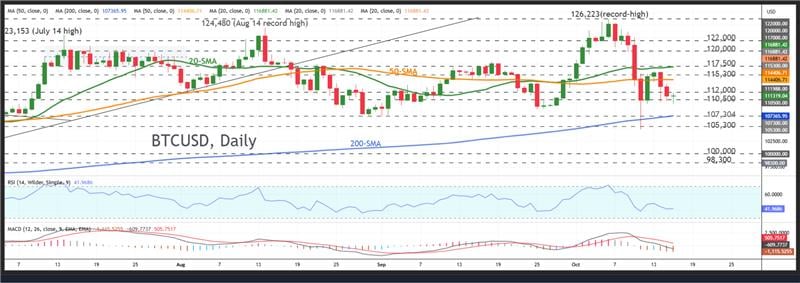 BTCUSD在11.1万美元附近盘整跌幅 动能指标显示看跌压力持续 比特币(BTCUSD)在经历两天超4%的急跌后,目前持稳于关键支撑位111,319美元附近,周初涨幅悉数回吐。受持续地缘政治紧张局势和经济不确定性影响,投资者情绪依然低迷,市场整体保持谨慎基调。 动能指标持续反映市场看跌压力。相对强弱指数(RSI)在50中性阈值下方走平,而MACD指标已跌入负值区域且远低于红色信号线,暗示后市仍有进一步下行风险。 若跌破自7月以来多次遏制跌势的110,500美元支撑位,比特币可能下探107,365美元附近的200日简单移动平均线(SMA)。有效跌破该水平或预示市场情绪转变,并使当前整体盘2025-10-16