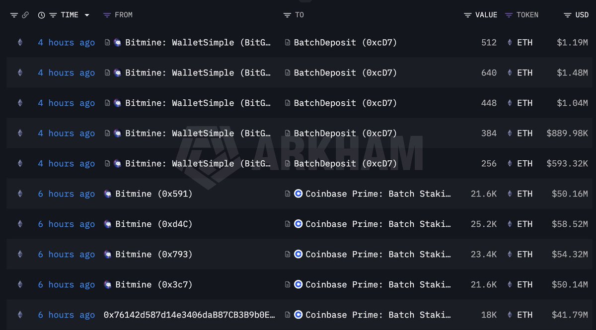 Bitmine再质押10万枚ETH…累计质押量达314万枚