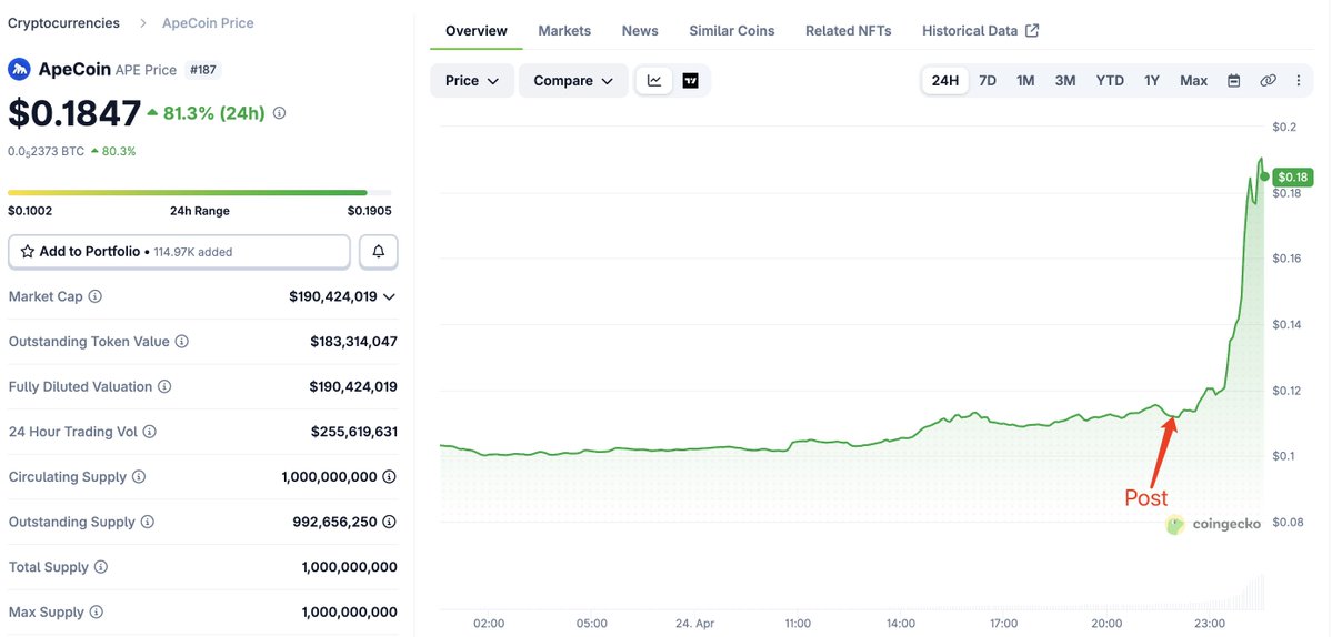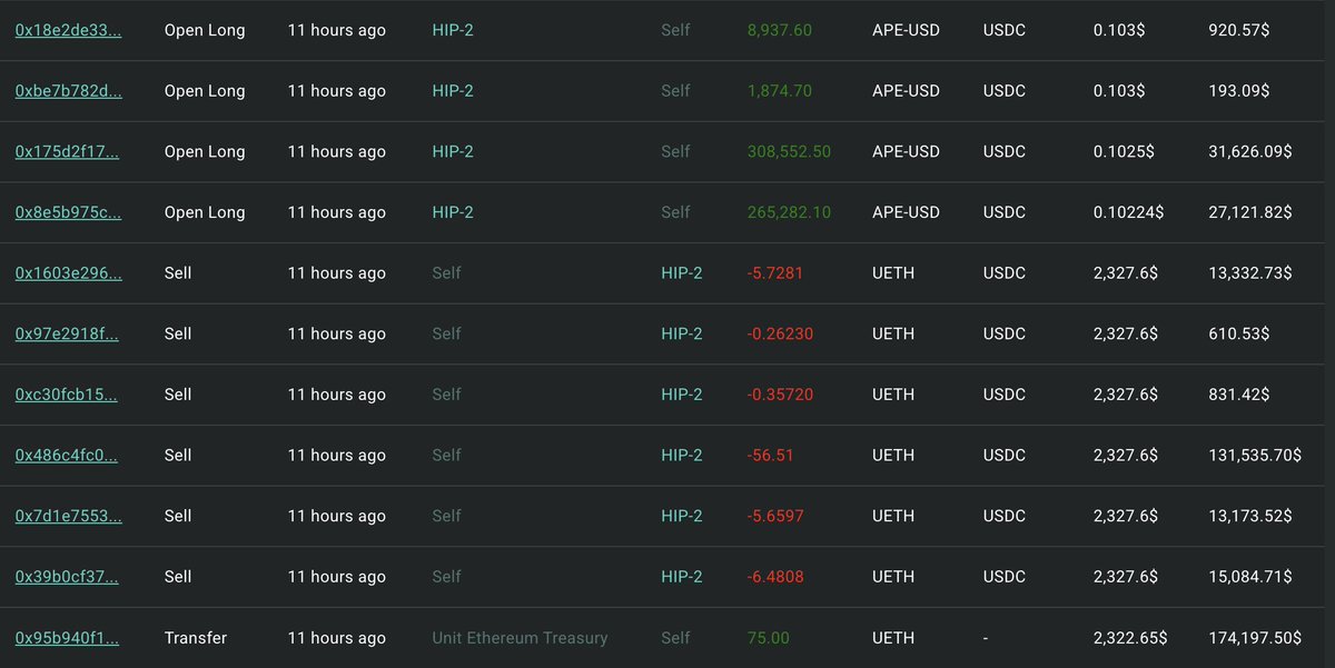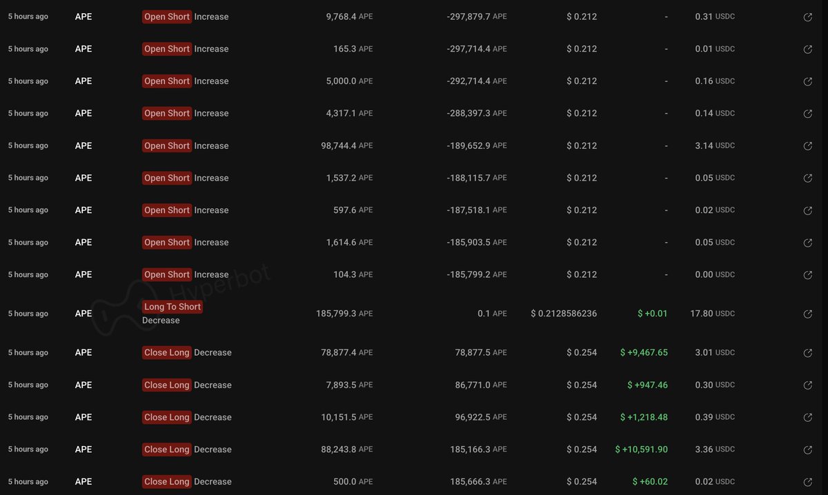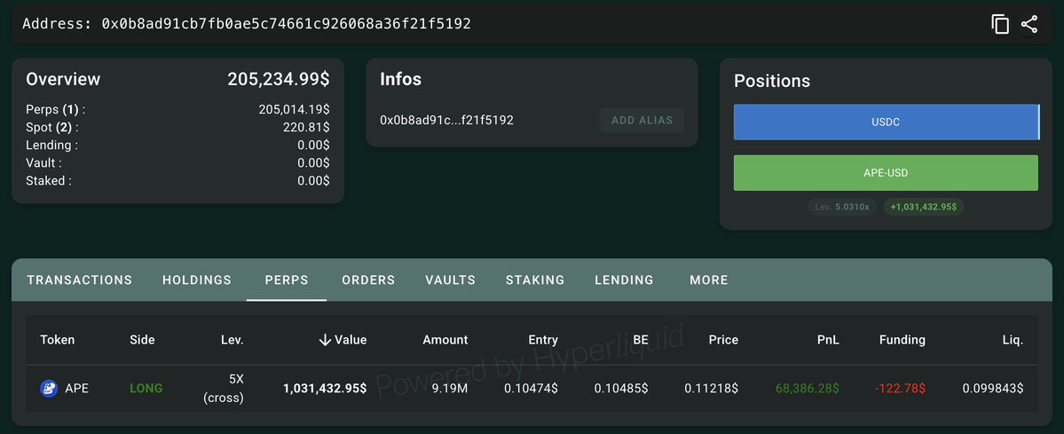 内部人士0x0b8a在$APE暴涨前做多,并在接近高点时平仓,获利179万美元。