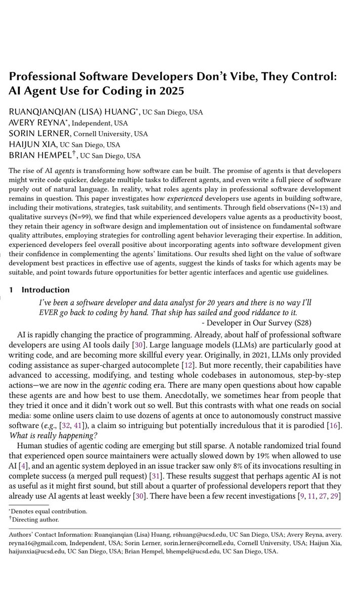 UC San Diego观察了13位经验丰富的开发者在实际中使用AI代理。另外调查了99位。他们中没有一个人"屈服于氛围"。