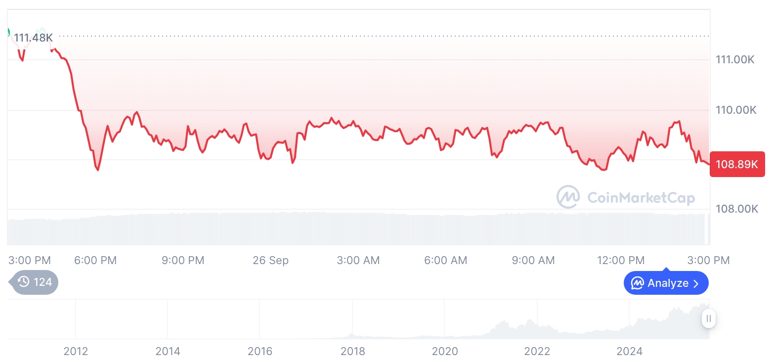 《午夜行情速递》加密货币市场走低……比特币报10万8891美元,以太坊跌至3933美元
