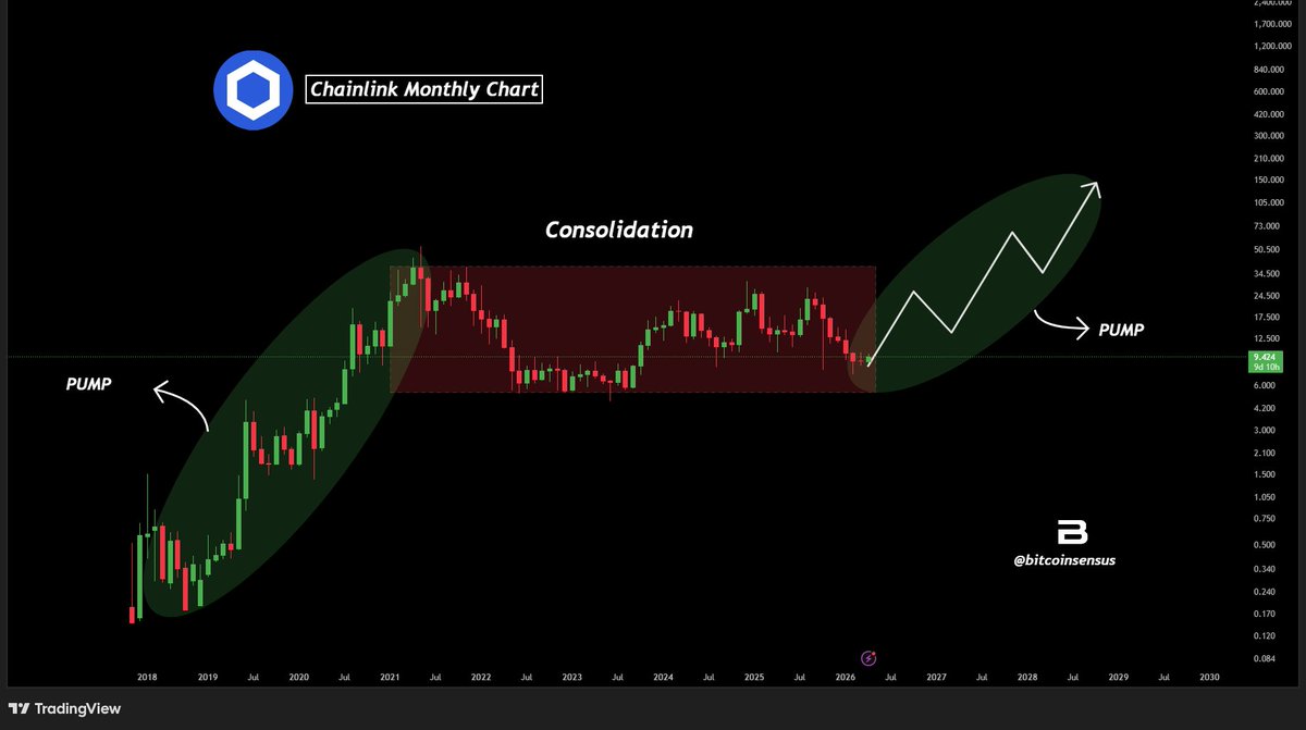 Chainlink 在之前的扩张阶段后,仍然处于月线图上的多年宽幅盘整区间内。🎯