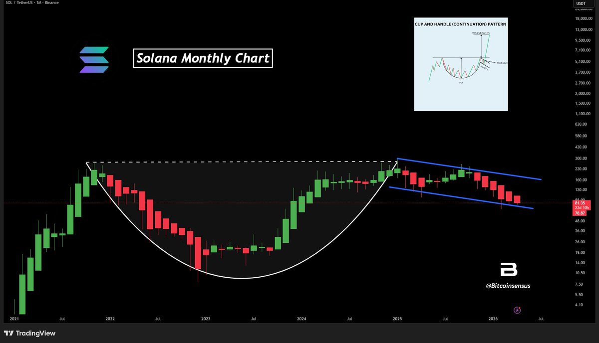 Solana的月度结构类似于一个大型杯形形态,价格现在在一个下行通道内走低,可能正在形成先前水平阻力下方的“柄”。