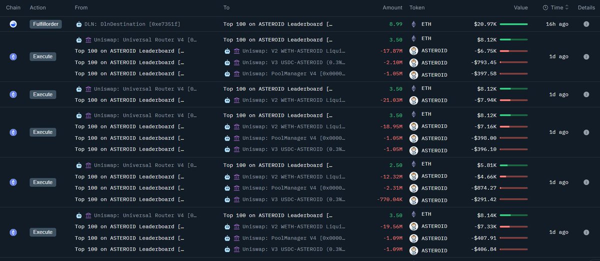 钱包 "0x970" 出售了所有2.9B $ASTEROID,换取了价值117万美元的$ETH和$BNB。购买成本仅为10,962美元,利润达116万美元。