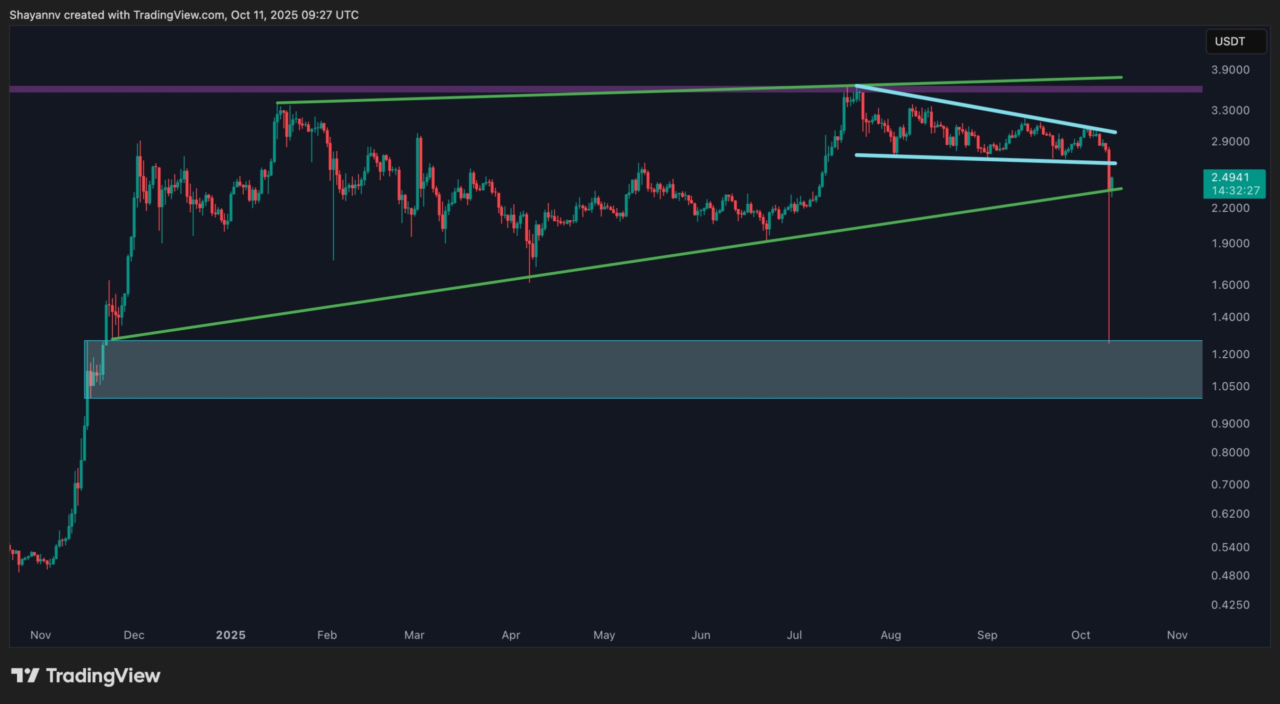 特朗普关税政策引发市场历史性抛售 瑞波币(XRP)同步暴跌 特朗普宣布加征关税的声明引发全球市场历史级连锁抛售,加密货币市场同样未能幸免。随着恐慌情绪蔓延,XRP在日线及4小时图上连续跌破多个关键技术支撑位。 尽管当前价格在2.4美元附近显现企稳迹象,但市场脆弱性依然存在,对后续宏观政策变化保持高度敏感。 瑞波币技术分析 在美国前总统特朗普威胁对中国商品加征100%关税的推文发布后,加密货币市场遭遇年内最剧烈单日抛售。短短数小时内,近9000亿美元市值蒸发,随后才出现小幅回升。 日线图表观察 XRP从3.0-3.1美元阻力带急速下挫,彻底跌破自7月以来形成的多个月对称三角形结构。下降趋势2025-10-12
