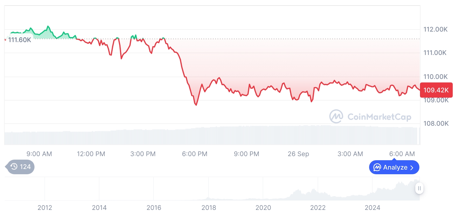 加密货币市场呈现整体下跌趋势 根据TokenPost市场数据,截至2025年9月26日下午,比特币报价为109,461美元(约合1.5466亿韩元),较前日下跌1.85%;以太坊报3,922美元(约合554万韩元),跌幅达1.88%。 主流竞争币价格走势 市值排名靠前的竞争币同样普遍走低。当前加密货币总市值为3.7447万亿美元(约合5291万亿韩元),过去24小时总交易量达2261.7153亿美元(约合319万亿韩元)。 市场份额变化 比特币市场占有率达58.24%,较前日微增0.04%;以太坊占比12.65%,增幅0.016%。 去中心化金融与稳定币动态 去中心化金融市场呈现小幅回升 -