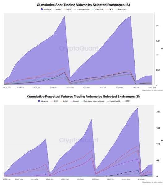 尽管竞争日益激烈,Binance在现货和永续合约方面仍然是规模最大的。