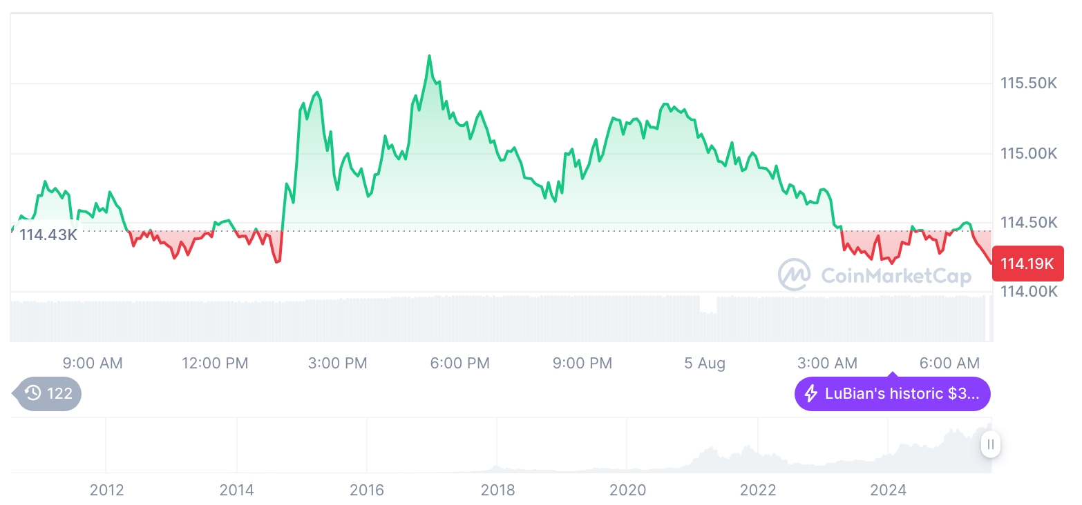 加密货币市场呈现震荡走势 截至8月5日下午,加密货币市场整体表现分化。据行情数据显示,当前比特币(BTC)报价114,158.80美元(约合1.58亿韩元),较前日下跌0.25%;以太坊(ETH)报3,648.88美元(约合507万韩元),涨幅达3.09%。 主流竞争币价格波动 主流竞争币走势呈现分化态势,但整体维持上涨趋势。 市场规模与交易量趋势 加密货币总市值达3.738万亿美元(约5195.8万亿韩元),24小时交易量为1385亿美元(约192.5万亿韩元)。 比特币与以太坊市占率变化 比特币市占率降至60.77%,较前日下滑0.43%;以太坊市占率则上升0.30%至11.78% -
