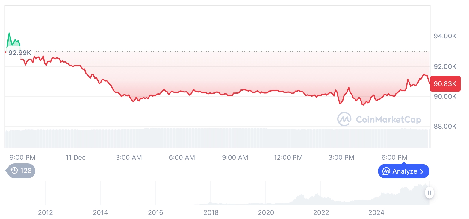 晨间行情简报:加密货币市场现跌势,比特币报90,835美元,以太坊跌至3,195美元