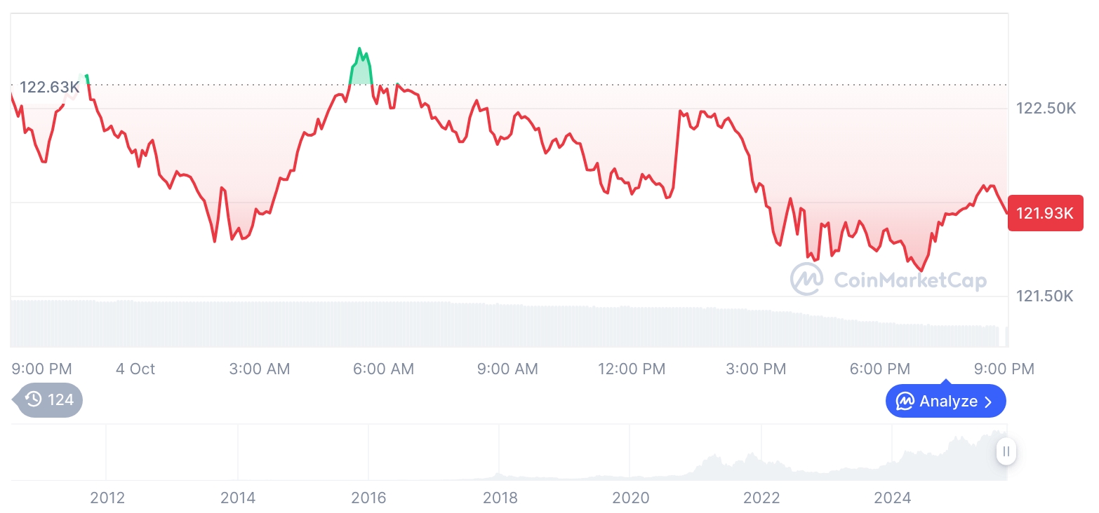 《晨间市场快报:加密货币市场下行,比特币报121,962美元,以太坊跌至4,478美元》