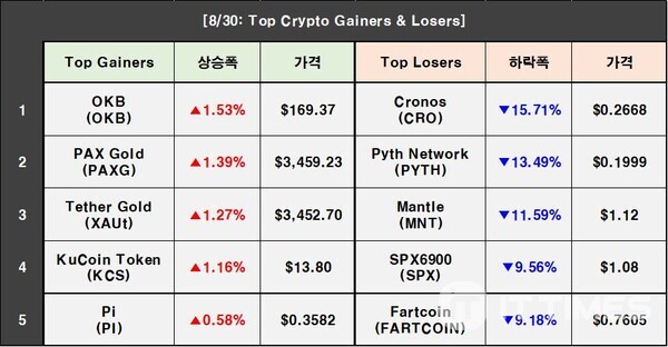 2025年8月30日加密货币市场行情 8月30日加密货币市场普遍下跌,多数主流数字资产呈现下行趋势。 主流币种表现 根据行情数据,截至韩国标准时间上午11时:比特币(BTC)下跌3.56%至107,515.34美元;以太坊(ETH)跌幅达4.19%,报4,270.96美元;瑞波币(XRP)重挫5.77%至2.77美元。狗狗币(DOGE)下跌3.79%至0.2121美元,Solana(SOL)暴跌5.69%至201.43美元,雪崩协议(AVAX)跌幅最大达6.31%,报23.18美元。柴犬币(SHIB)下挫3.75%至0.00001206美元,Aptos(APT)下跌4.43%至4.20美元, -